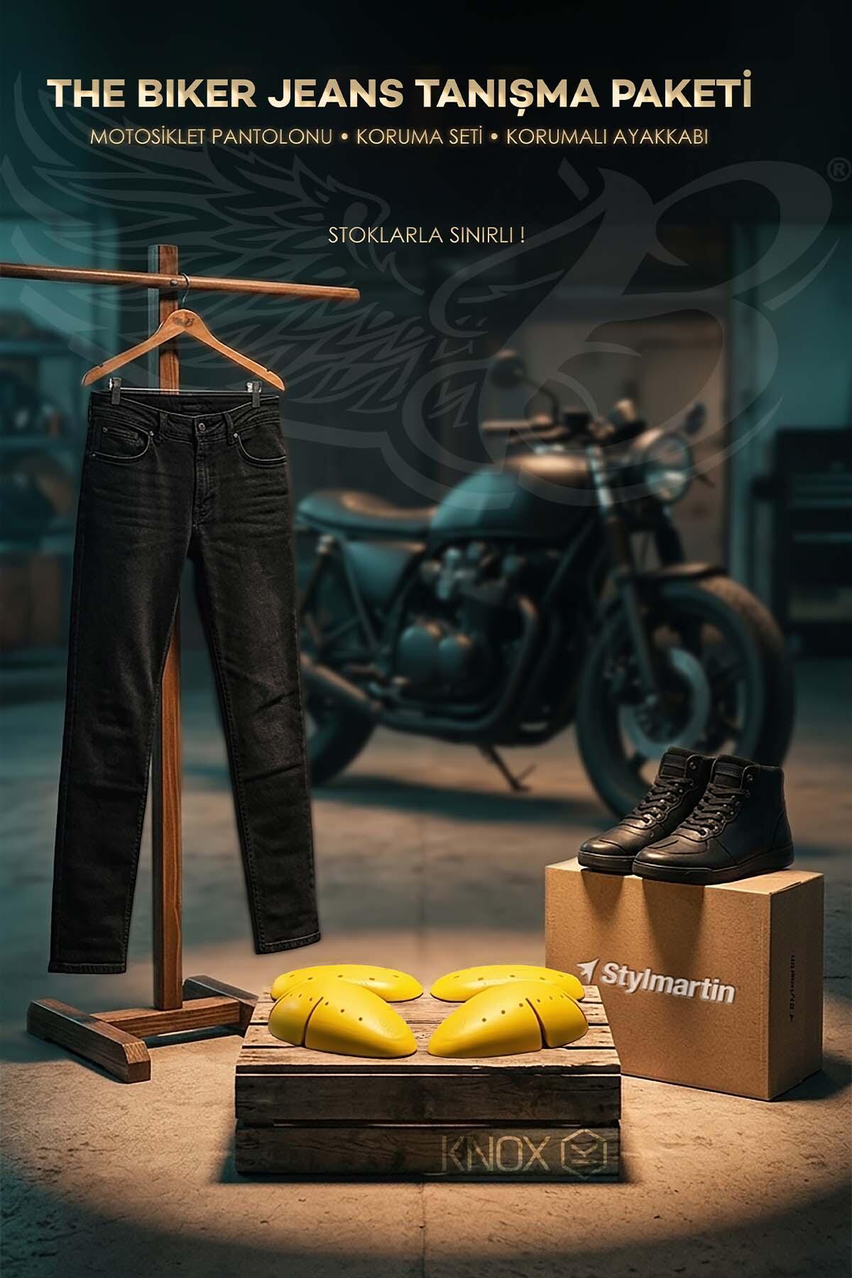 Tanışma Paketi İçeriği: Urbanizer Motosiklet Kot Pantolonu (Class A) Knox Microlock Pantolon Koruma Seti Stlymartin Piper WP Black Korumalı Motosiklet Ayakkabısı